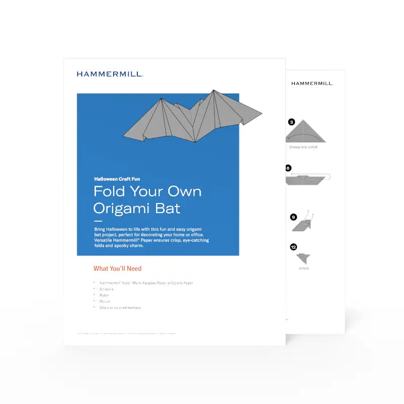 Bring Halloween to life with this fun and easy origami bat project, perfect for decorating your home or office. You’ll need just scissors, a ruler, a black marker and — of course — paper. Choose versatile Hammermill® Paper for crisp, eye-catching folds and spooky charm.